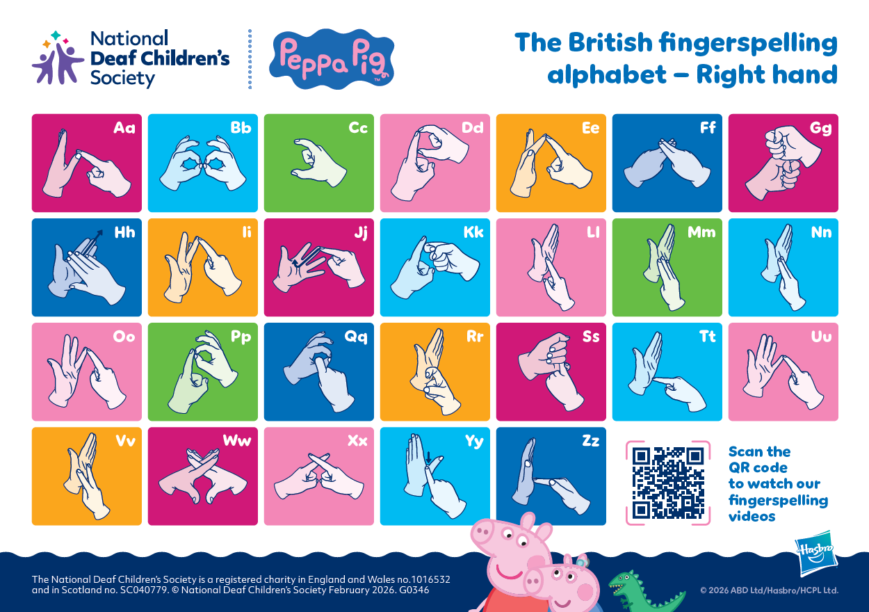 A postcard featuring the left-handed British Sign Language (BSL) alphabet on one side and the right-handed BSL alphabet on the other. Share with others at fundraising activities, deaf awareness events, exhibitions, schools or with friends and family!